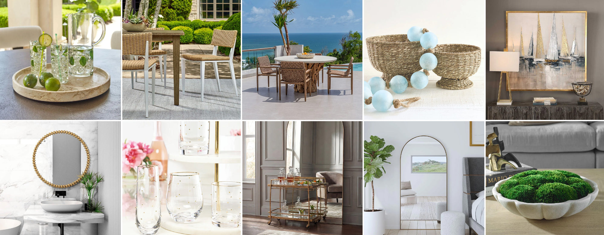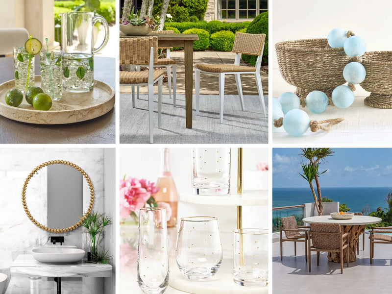 Collage of outdoor furniture, glassware, a decorative mirror, and coastal-inspired decor in bright, airy settings.